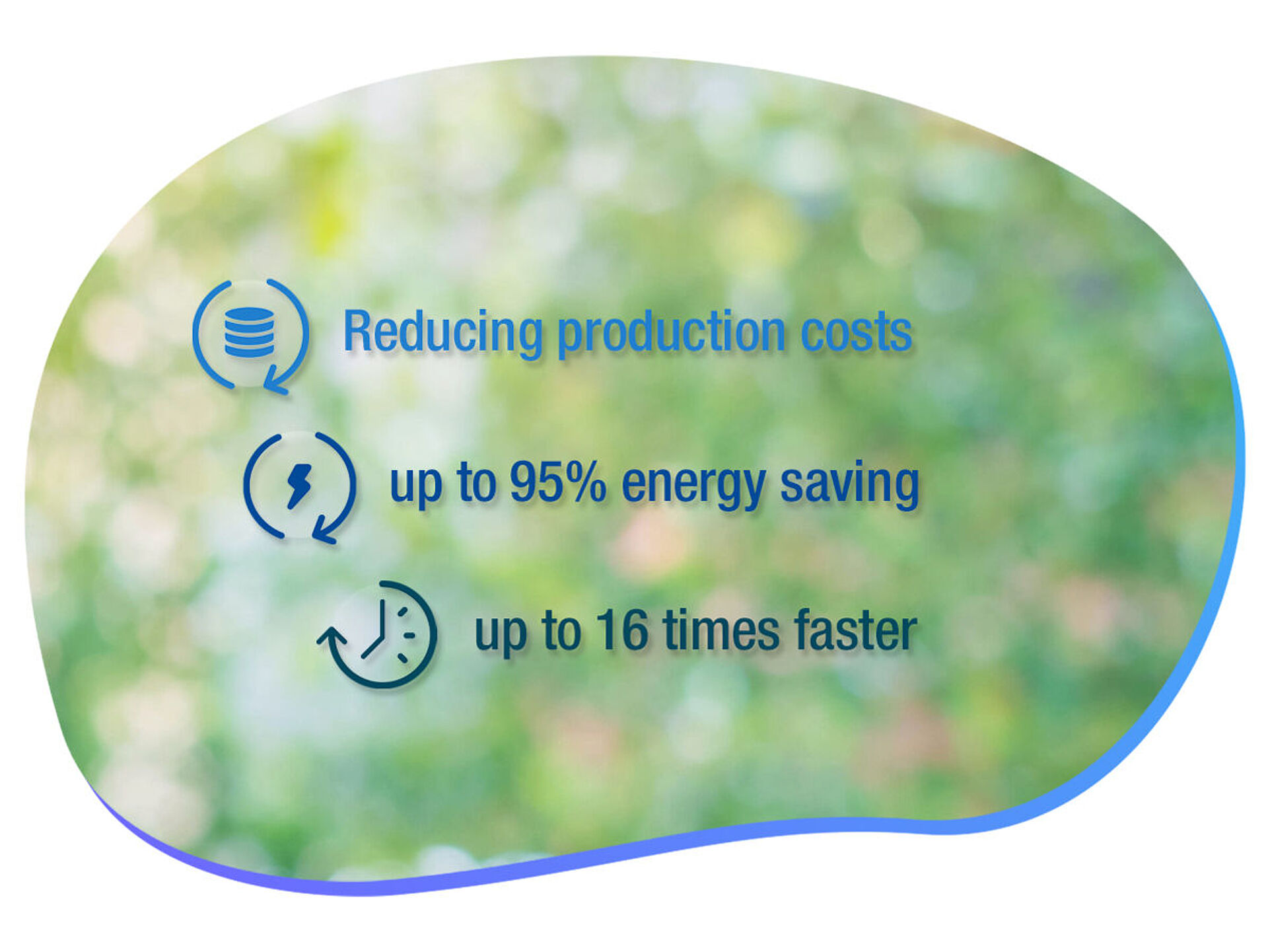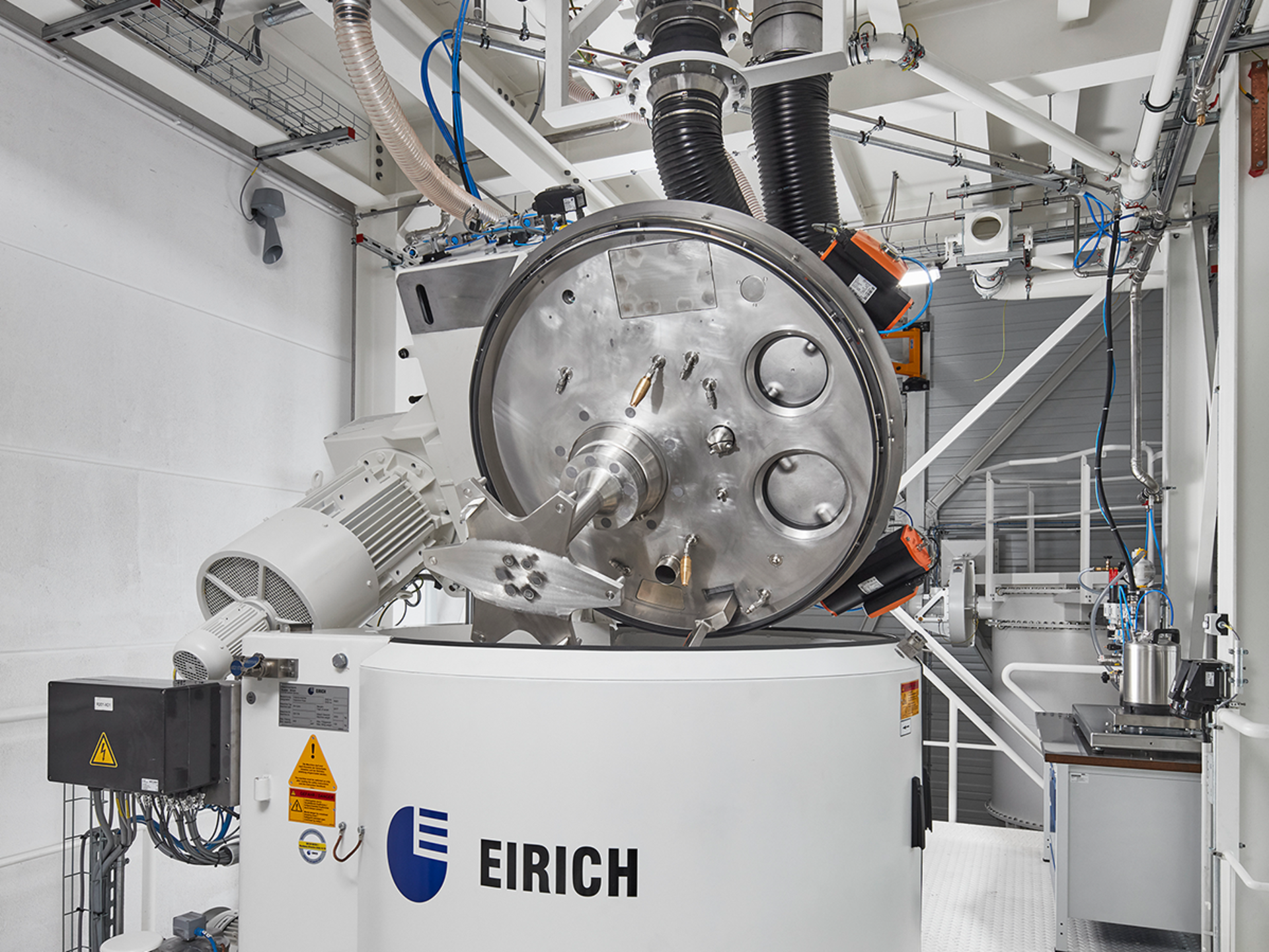 MixSolver® uses far less energy in the production of electrode slurry than a planetary mixer. A planetary mixer consumes around 8,000 kWh of electric energy per day to achieve a daily throughput rate of 20 m3 of slurry, while an Eirich mixer requires just 400 kWh to do the same – a vast cost saving. And this does not even take into account the energy required for cooling, which can be around the same amount again for a planetary mixer but is not required at all for an Eirich mixer. Instead of running 5-9 high-volume planetary mixers in parallel, each of which requires 4-8 hours for a single batch, you can produce the same amount of slurry in one or at most two MixSolvers® in just 30 minutes. In addition, you will also benefit from a huge reduction in floor space requirements, with the Eirich Mixer only needing a third of the space required for planetary mixers.